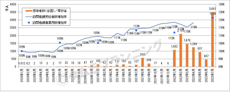 コロナ禍でニーズの高い訪問系サービスが伸びて、訪問看護・受給者数は2020年1月時点より15%~19%増加