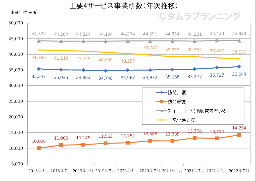 主要4サービスの事業所数の年次推移を見ると、最も顕著であるのが訪問看護並びに居宅介護支援となり、訪問看護は右肩上がりで増加が続き、2018年1月10,026ヶ所から2022年7月には14,254ヶ所と約4千ヶ所増となっています。