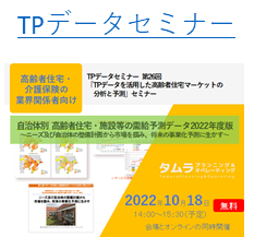 当社では、高齢者住宅・介護サービスに特化したデータベースとコンサルティングに長年の実績を持ち、2005年よりデータベースと分析レポートを組み合わせたTPデータ・サービスを提供しており、高齢者の住宅から介護サービスに関わる業界動向の情報を集約・提供しています。