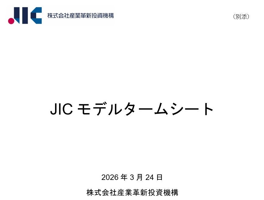 株式会社産業革新投資機構(本社:東京都港区、代表取締役社長CEO:横尾敬介、以下「JIC」)は、この度、VC向けの主要な契約条件をまとめた「JICモデルタームシート」を公表しました。