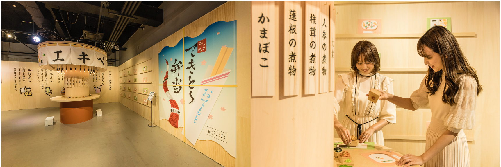 ここは、日本の鉄道でこそ楽しめるグルメコンテンツ「駅弁」をモチーフにした「てきと~駅弁作り」。駅弁は弁当箱の形から具材のバラエティさ迄、無数の組み合わせの中から構成されています。エキベン・タウンでも様々な弁当箱から選んで、約28種もの具材のスタンプを押すことで、自分だけの「てきと〜駅弁」を作ることができます。