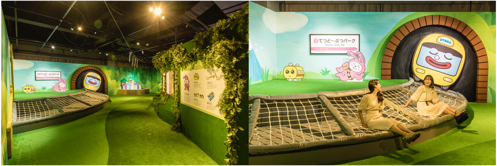 てきと〜な鉄道展の中の唯一の休憩エリアであるこの場所では、座って、寝転んで、電車も運休中。メインに横切る「寝レール」に、チンアナ号が集まるボールプール等、遊んで寝れる「プレイパーク」です。てつどうさぎを筆頭としたバラエティ豊かな「てつど〜ぶつ」達と出会えます。