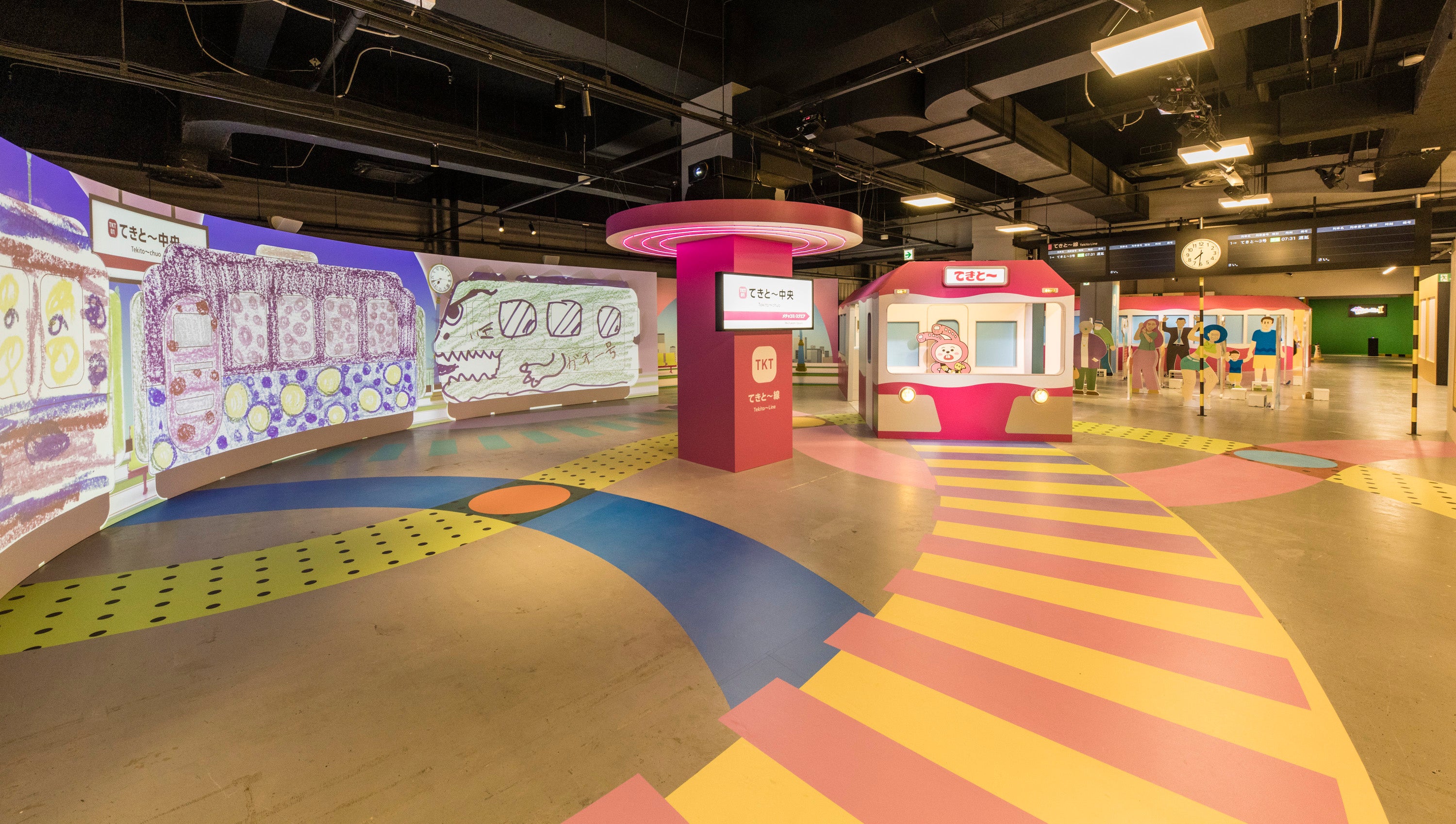 てきと〜な切符を受け取ってほぼ自動改札から入場すると、約1,000㎡もの敷地内には、“てきと〜”を楽しめるよう創られたコンテンツが詰め込まれています。来場者は、全長42.5mにもなる「てきと~線」というぐにゃぐにゃの車両から、「てきと〜中央駅」、「エキベン・タウン駅」、「メチャコミ・スクエア駅」、「てつど〜ぶつパーク駅」、そして「ゲーム・ステーション駅」という主に5つの「てきと~」で楽しい駅(エリア)を各々下車しながら、体験型展示を楽しみます。