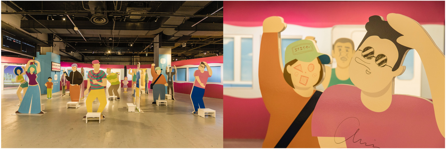 日本の鉄道では日常風景の一部でもある“満員電車”。一見、この窮屈そうな状況を、大学生、サラリーマン、おばあさんなど様々な人たちが個性的な服装とポーズで集まったインスタレーションコンテンツに。満員電車や混雑したプラットホームを、ポップな作品としてお楽しみください。