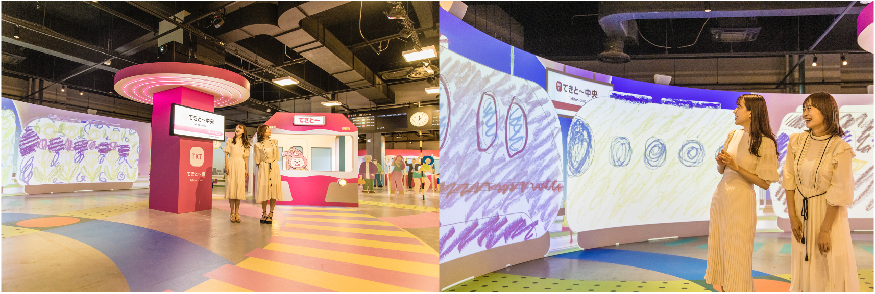最初のエリアで楽しめるのは「てきと〜お絵かき電車」です。その場で自分の描いた電車のイラストが、全長約9mもの巨大なプロジェクションマッピングに投影され、まるで本物の駅のように入ってくる様子を楽しむことができます。駅さながらに表現された電光掲示板や案内板のてきと〜さ加減をお楽しみください。