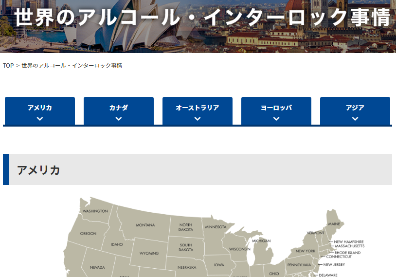 アメリカ、カナダ、ヨーロッパ、オーストラリア等、アルコールインターロック先進国について解説しています。各国の各州ごとのインターロック法令をデータベース化し、日本の法制化の参照事例を探索する試みをしています。