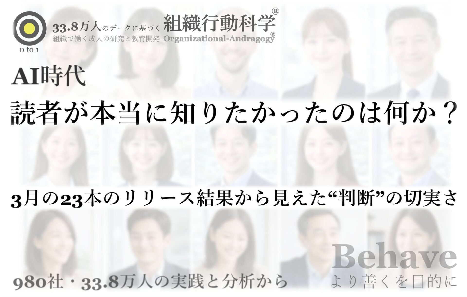 今回の23本は、AI時代の変化を単発の論点として切り出すのではなく、33.8万人・980社の実践と分析をもとに、仕事の変化、判断経験の減少、熟練者への集中、人材育成の再設計を一連のテーマとして発信し、その反響を通じて読者の関心がどこに集まるのかを確認してきたものです。