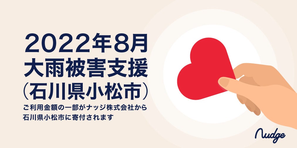 普段のお買い物などでNudgeカードをご利用いただくと、ご利用金額の一部がナッジ株式会社から石川県小松市に寄付され、大雨被害の支援のために使われます。