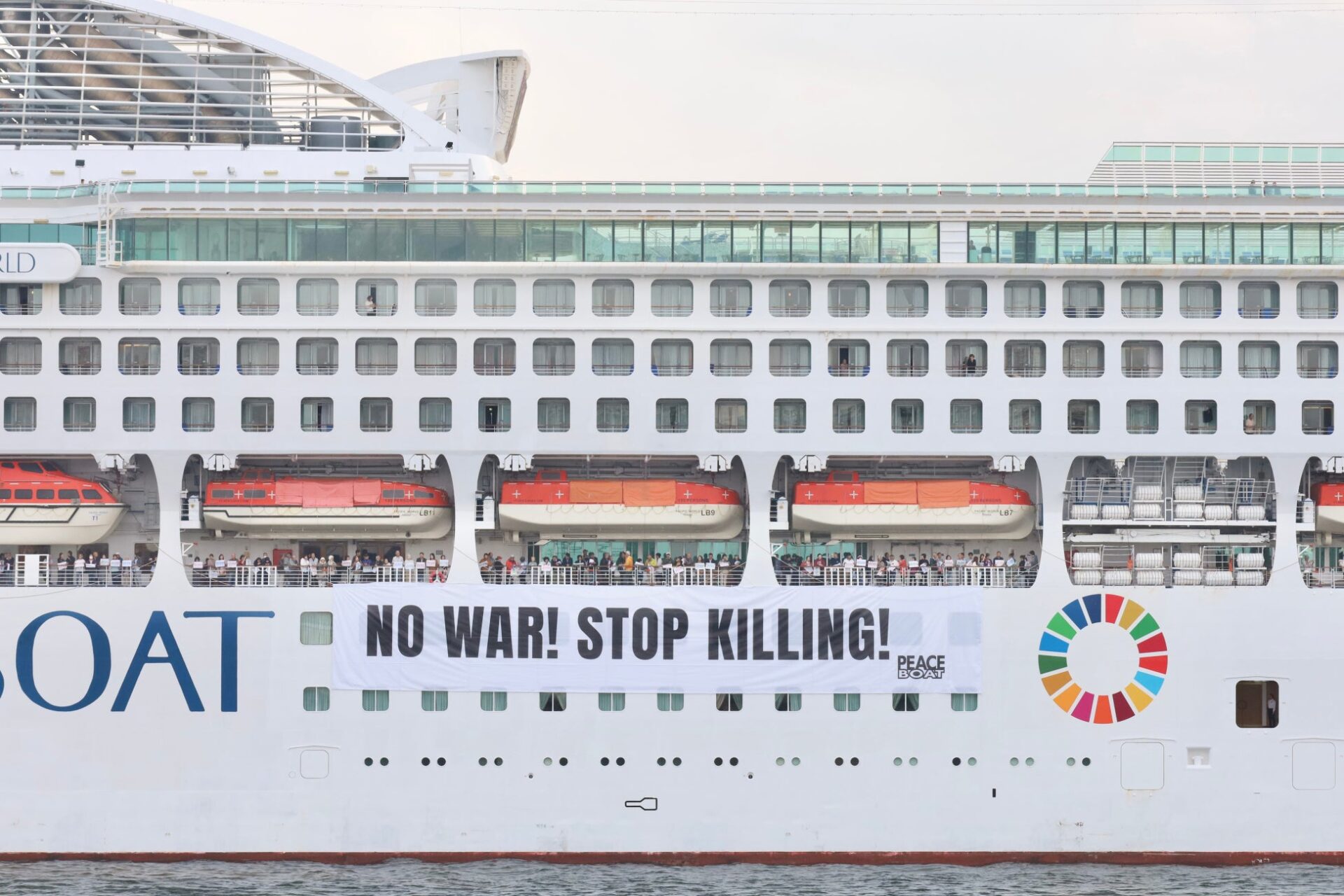 神戸入港時、船体には「NO WAR! STOP KILLING!」と書かれた30m×5mの巨大なバナーが掲げられました。これに合わせてデッキには約300人の船旅参加者が集まり「NO WAR / 戦争反対」を訴えました。