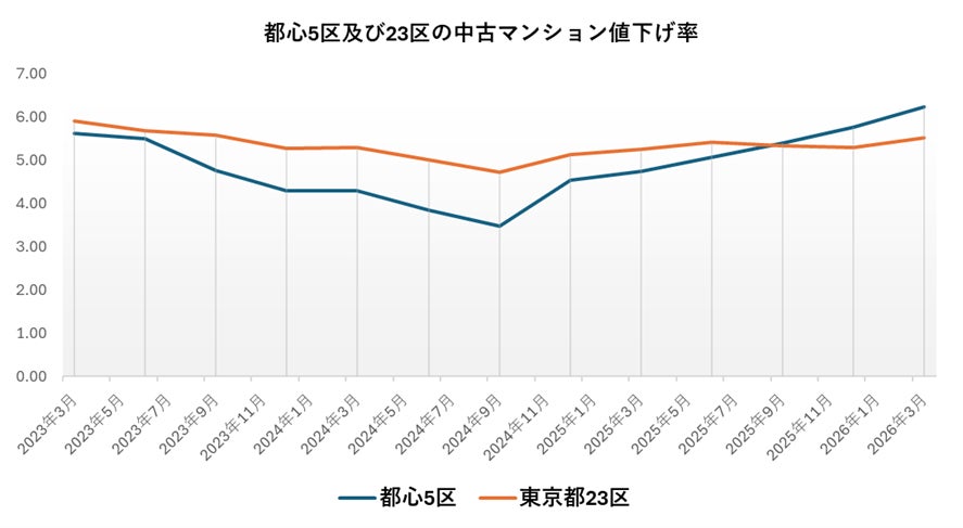 前四半期と比較して最も顕著な変化は、都心5区における値下げ幅の拡大です。2025年10月~12月における都心5区の中古マンションの値下げ率は5.77%であったのに対し、2026年1月~3月は6.24%へと上昇しており、これは2023年以降で最大の水準となっています。