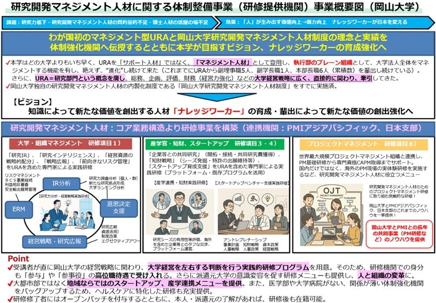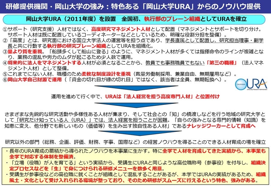 ・【岡山大学】文部科学省「研究開発マネジメント人材に関する体制整備事業」に採択~「知」から新たな価値を生み出すことのできる研究開発マネジメント人材の育成:岡山大学URAモデルなど特色ある取り組みを生かした研修を提供~