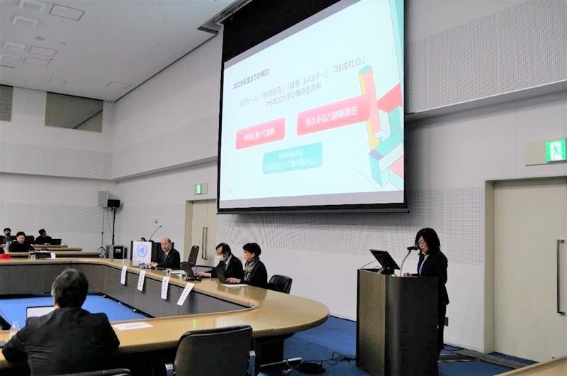 2026年3月13日、国連大学サステイナビリティ高等研究所(UNU-IAS)が、SDG大学連携プラットフォーム(SDG-UP)に参加する大学とサステイナビリティの取り組みについて議論する公開シンポジウムを国連大学エリザベス・ローズ国際会議場で開催し、本学はSDG-UPのサステイナブルキャンパス分科会の代表として同分科会の活動成果を発表しました。