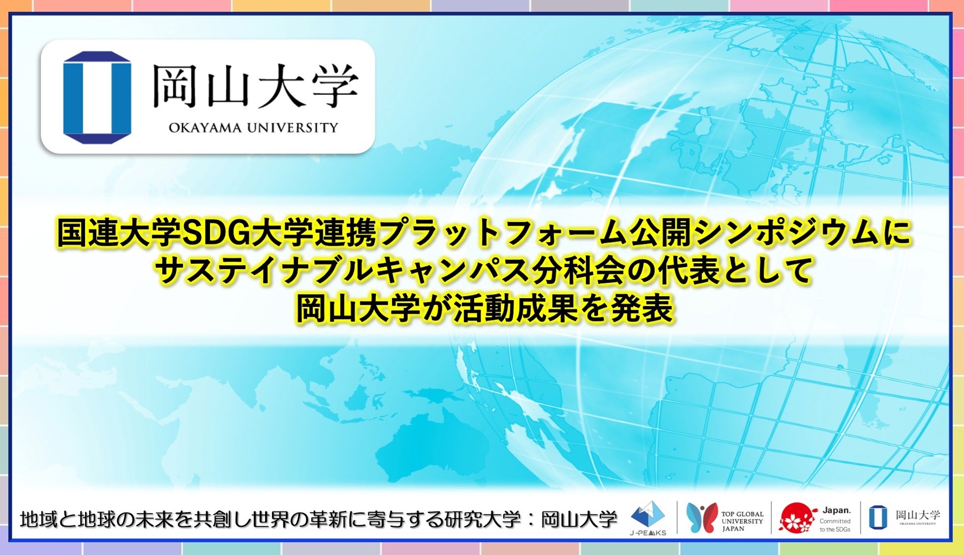 本学は今後もSDG-UPの活動を通じて、大学間の連携を深化、発展させ、若い世代を含めた多世代連帯を強化し、日本の取り組みを世界へ向けて発信していきます。引き続き、開かれた地域中核・特色ある研究大学:岡山大学の取り組みにご期待ください。