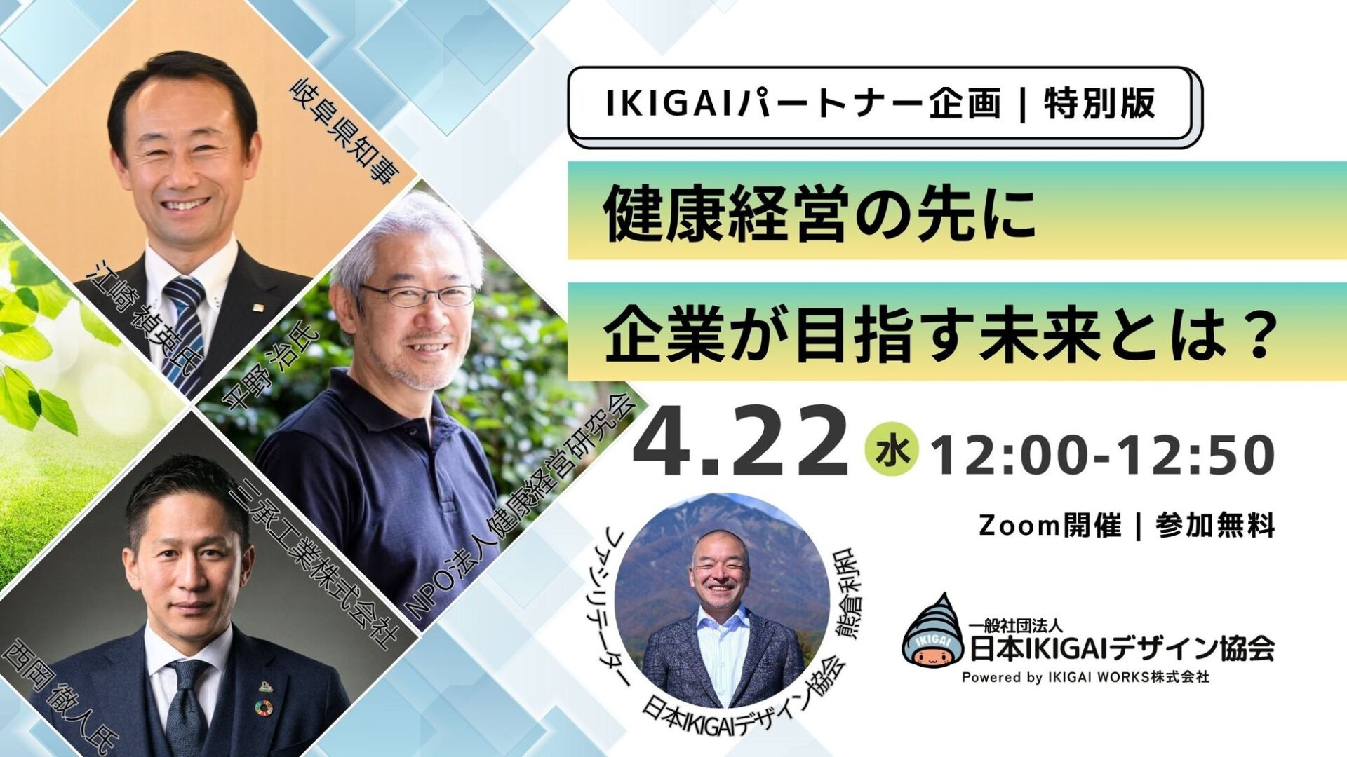 一般社団法人(本社:山梨県北杜市、代表理事:熊倉 利和、以下 IKIGAI社団)は、2026年4月22日にオンライン特別プログラムとして、健康経営の枠を超え、企業と働く人の新たな未来を探る『IKIGAIパートナーウェビナー特別版』を無料開催することをお知らせいたします。