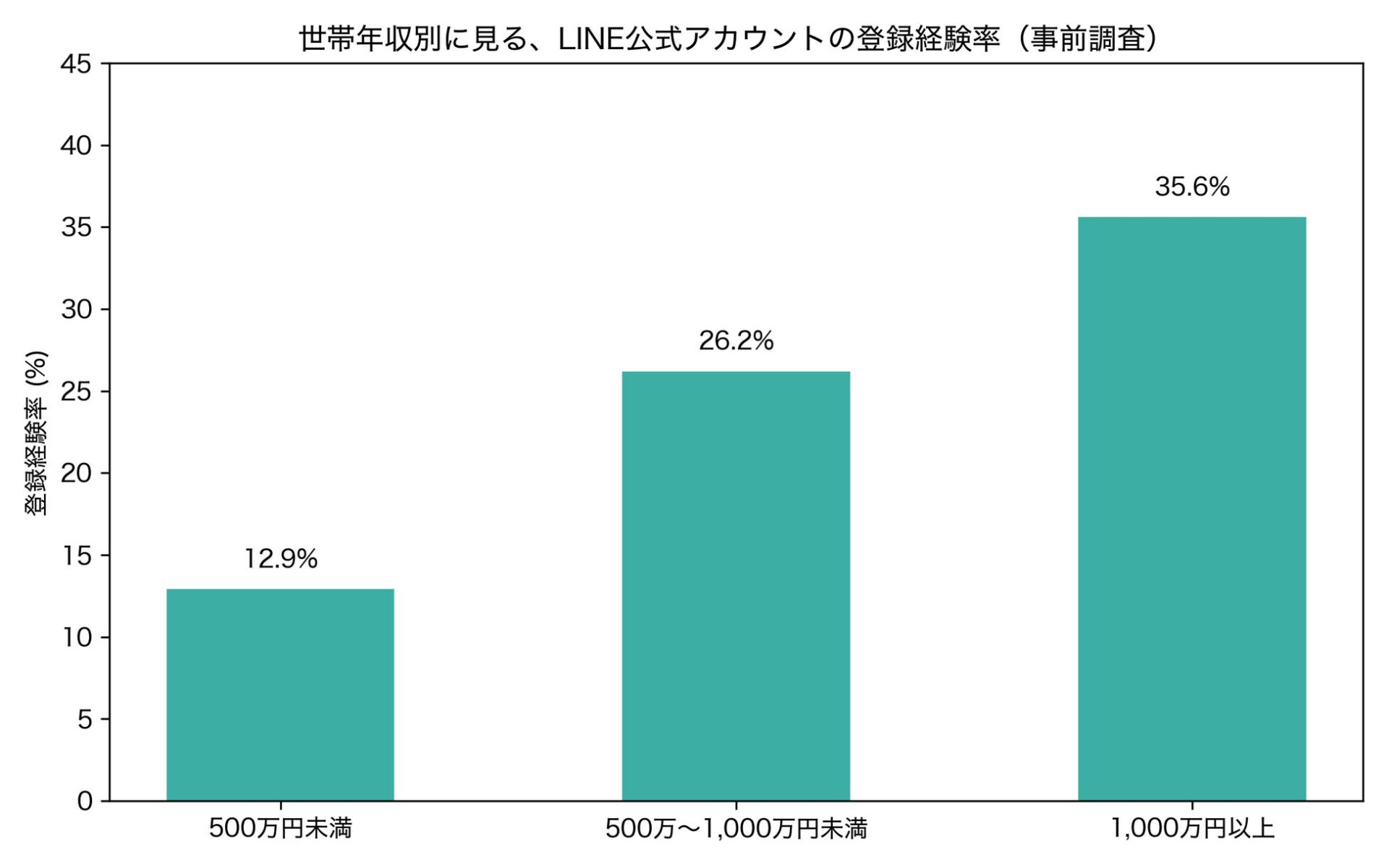 • 世帯年収別に見ると、LINE登録経験率は500万円未満で12.9%、500万〜1,000万円未満で26.2%、1,000万円以上で35.6%