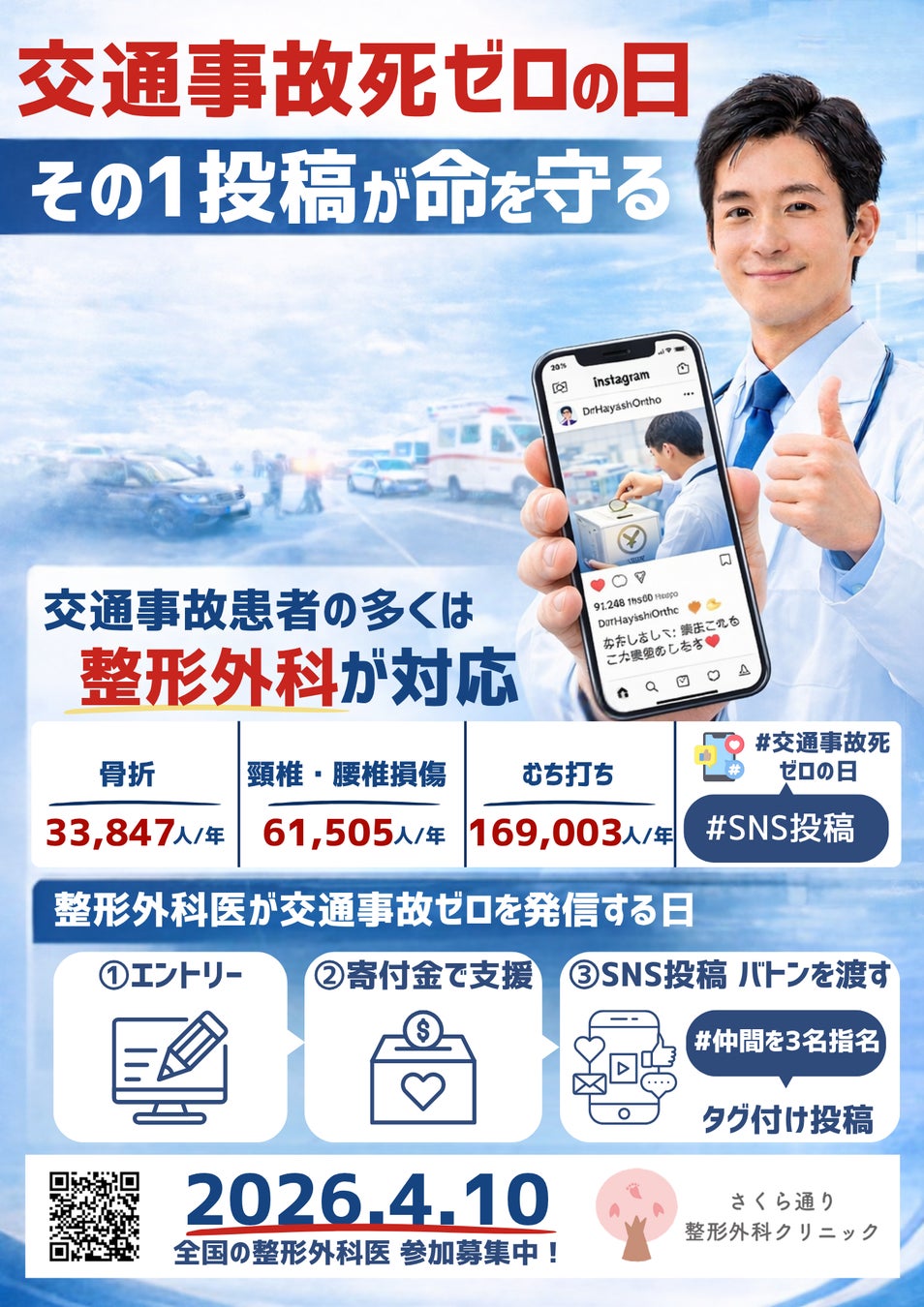 医療法人Eternabloom さくら通り整形外科クリニック(福井県福井市、院長:宇賀治修平)は、内閣府が定める「交通事故死ゼロを目指す日」(4月10日)に際し、寄付とSNS発信を通じた交通安全への意識啓発活動を行っています。本取り組みには、医療法人さわやか いでた整形外科クリニック(長崎県島原市)、うえだ整形外科クリニック(愛知県西尾市)、まつもと整形外科(福岡県久留米市)も賛同し、整形外科医同士のネットワークを通じて活動の輪が広がり始めています。