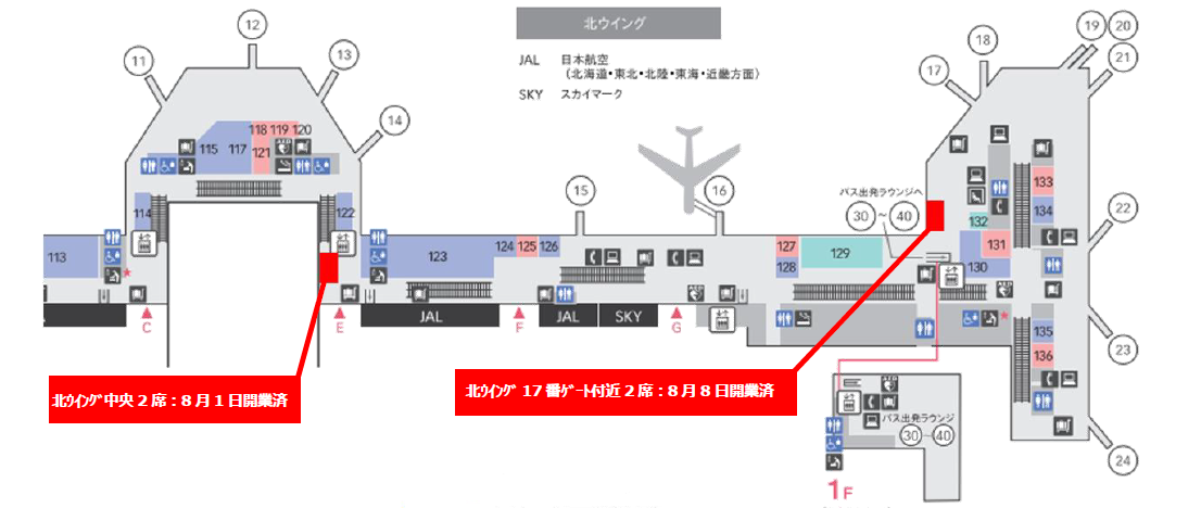 | 席数 | 4 席(2 席×2 ヶ所) ※北ウイング中央2 席:8 月1 日開業済 北ウイング17 番ゲート付近2 席:8 月8 日開業済 |