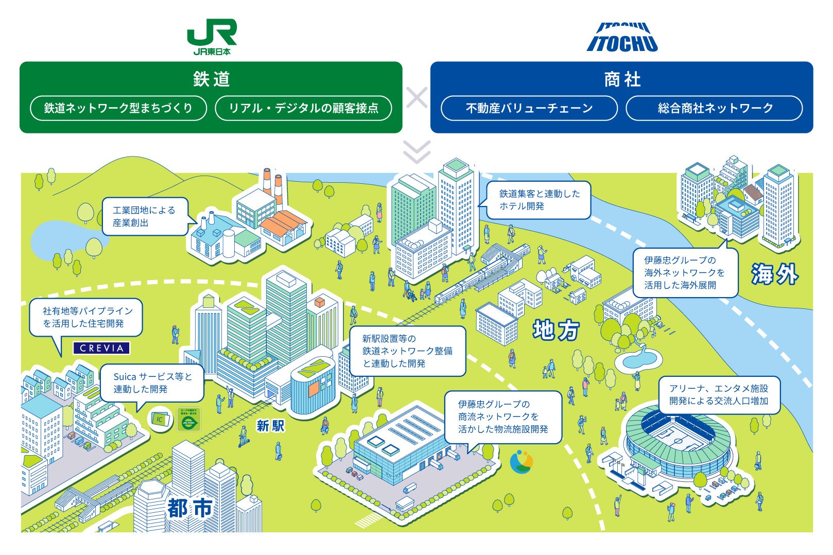 統合会社の商号は「JR東日本伊藤忠不動産開発株式会社」とし、JR東日本グループが有する鉄道ネットワーク、社有資産、顧客接点と、伊藤忠グループが培ってきた開発・投資・運営ノウハウを融合した総合不動産デベロッパーとして事業を展開してまいります。