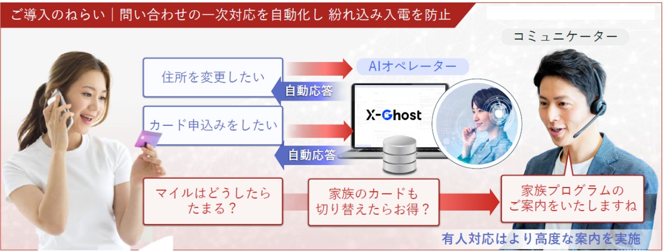 こうした課題を解決するため、対話型の自律型AIオペレーター「X-Ghost」を導入し、的確なヒアリングと振り分けにより、問い合わせ先を誤った入電の抑止を実現します。