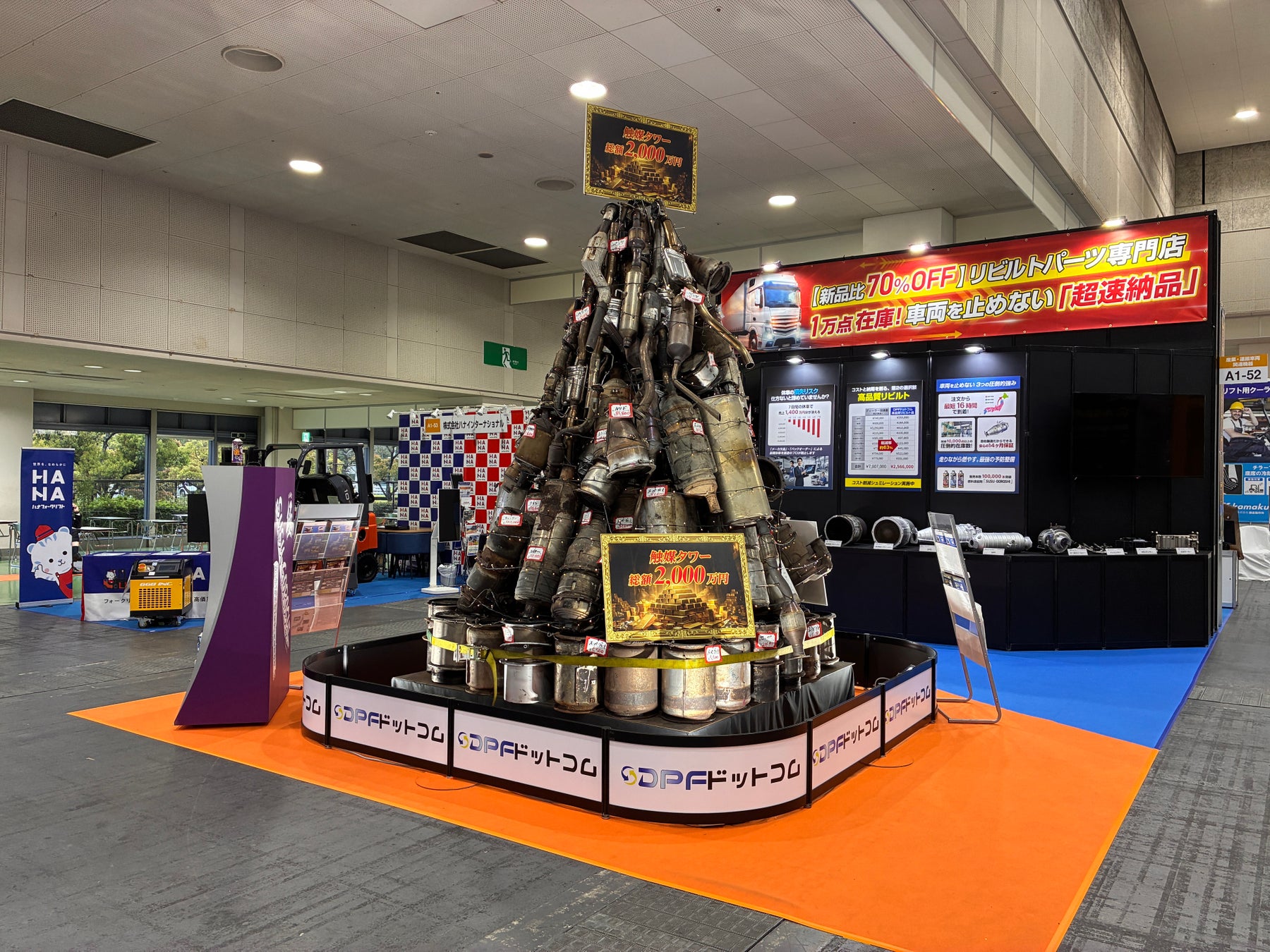 本来であれば廃棄されていた使用済みDPF触媒を、当社が買い取り・回収したもの──その買取総額2,000万円分を4メートルの高さに積み上げた「触媒タワー」をブースの象徴として設置。かつて「ゴミ」として処分されていた廃部品が、実は2,000万円もの経済的価値を持つ資源であることを可視化し、「廃棄コスト」を「利益」に変える当社の資源循環モデルを来場者に訴求しました。