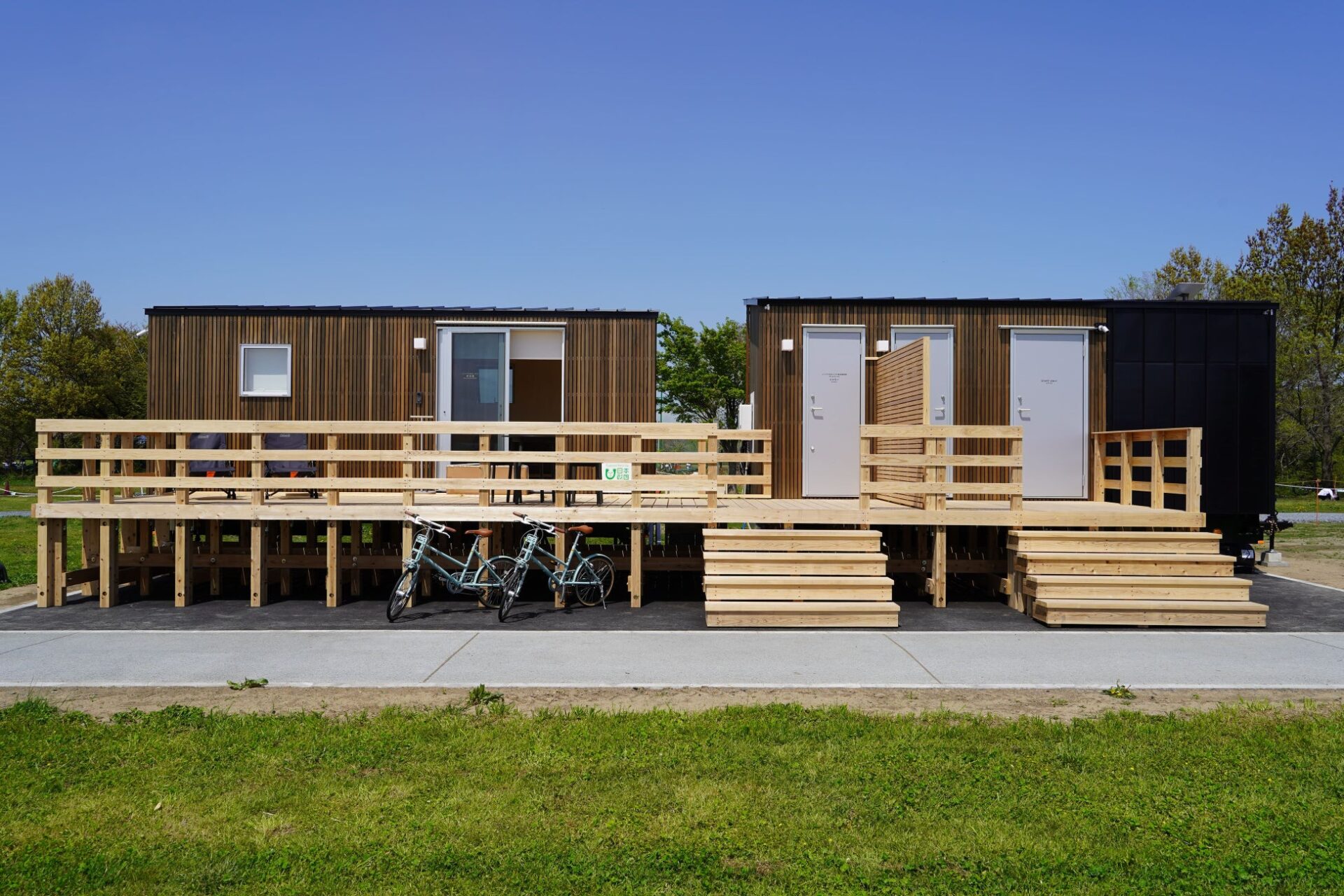 INNFRA Water搭載事例:道の駅富士川に設置されたINNFRA Base(右)とランドリートレーラー(左)