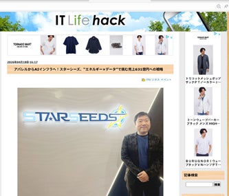 2026年4月18日にITライフハック様のⅩ(エックス)及びブログページにおいて、当社代表取締役(鈴木雅順)のインタビュー記事「アパレルからAIインフラへ! スターシーズ、〝エネルギー×データ″で挑む売上631億円への挑戦」が掲載されました。