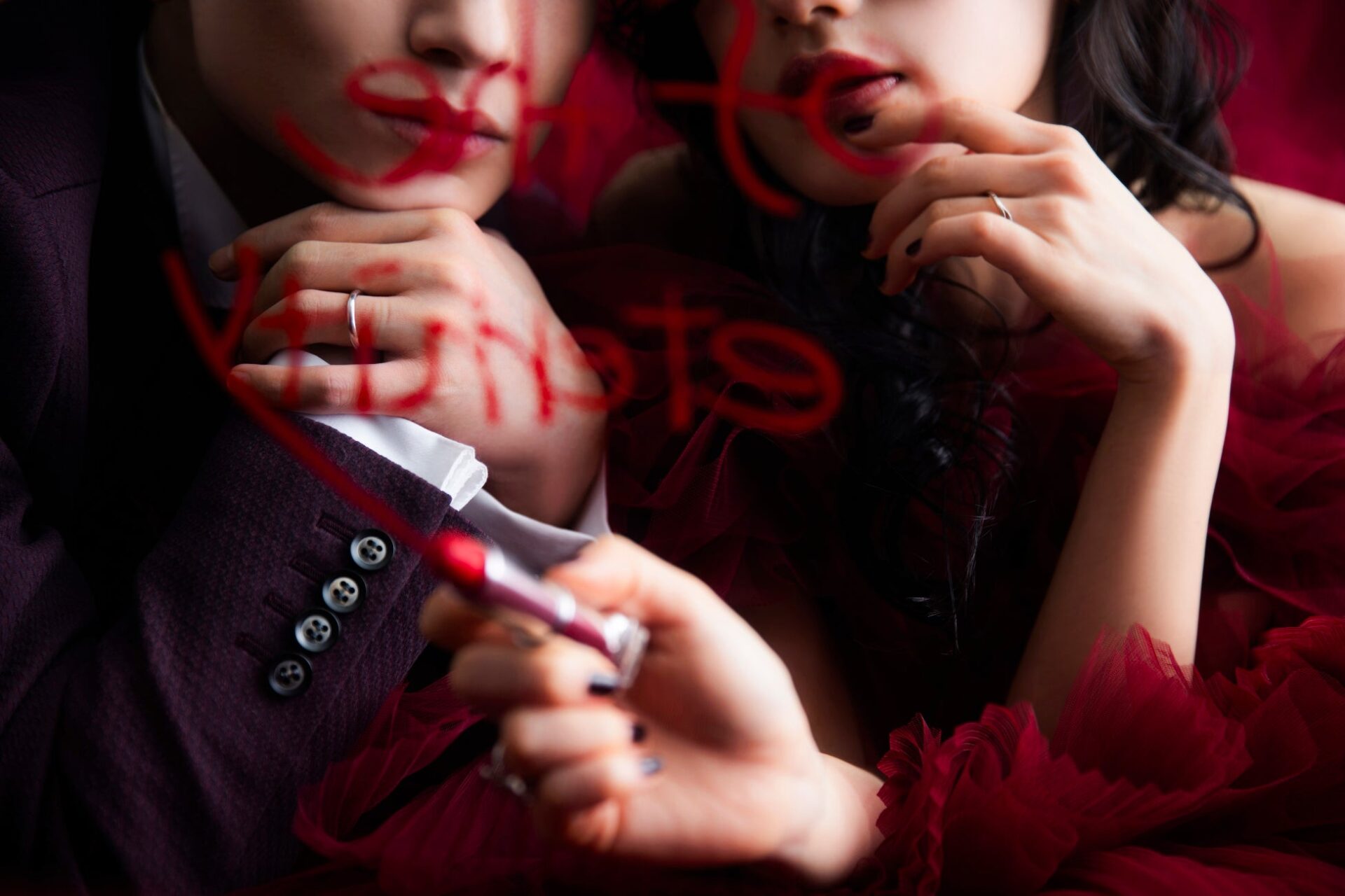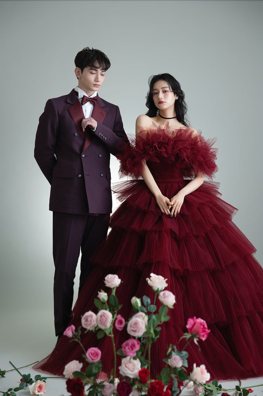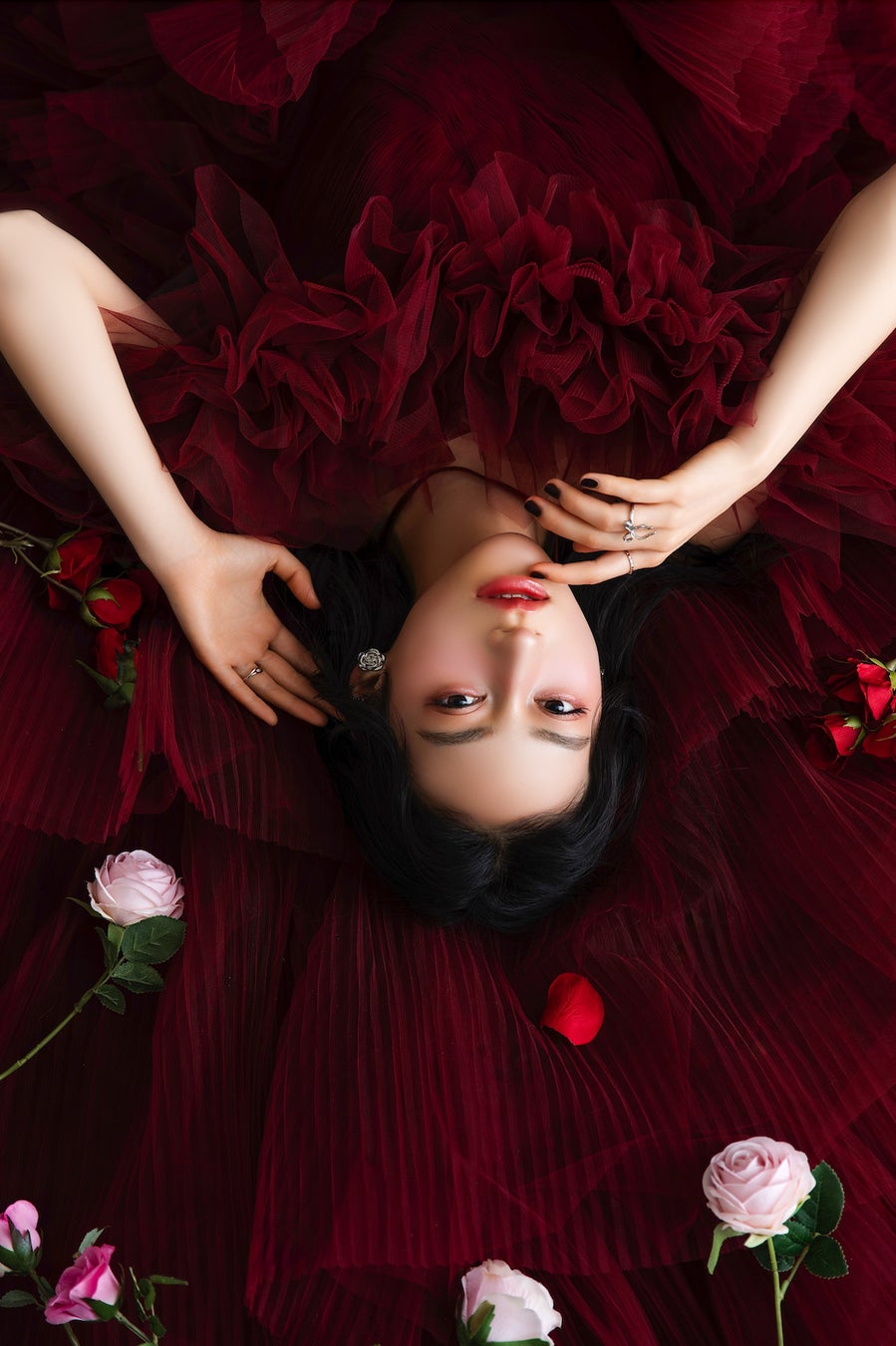 深紅ドレスのモードなハイファッション感に、空間とヘアメイクに甘さを足して、レディ感を。