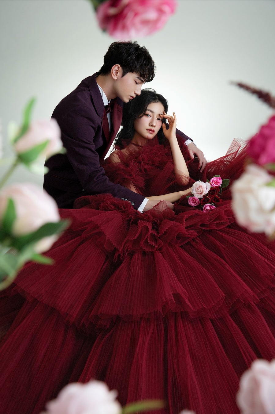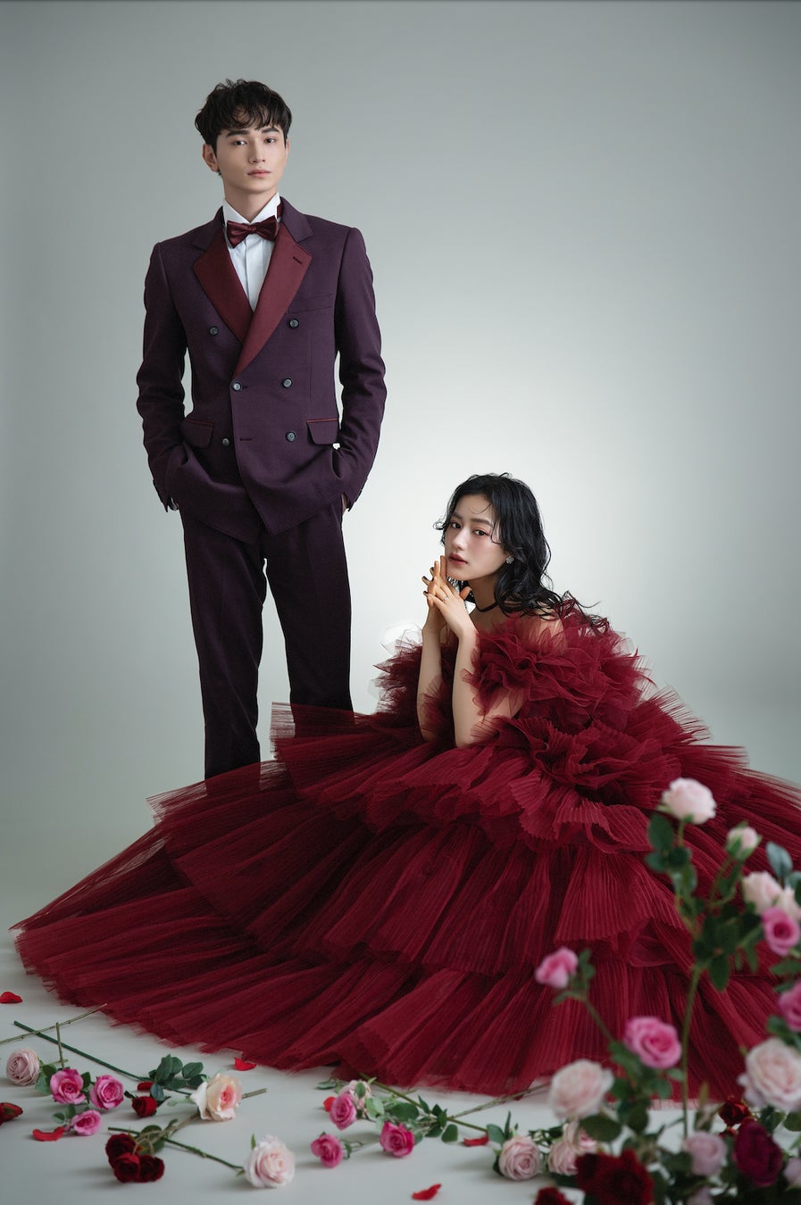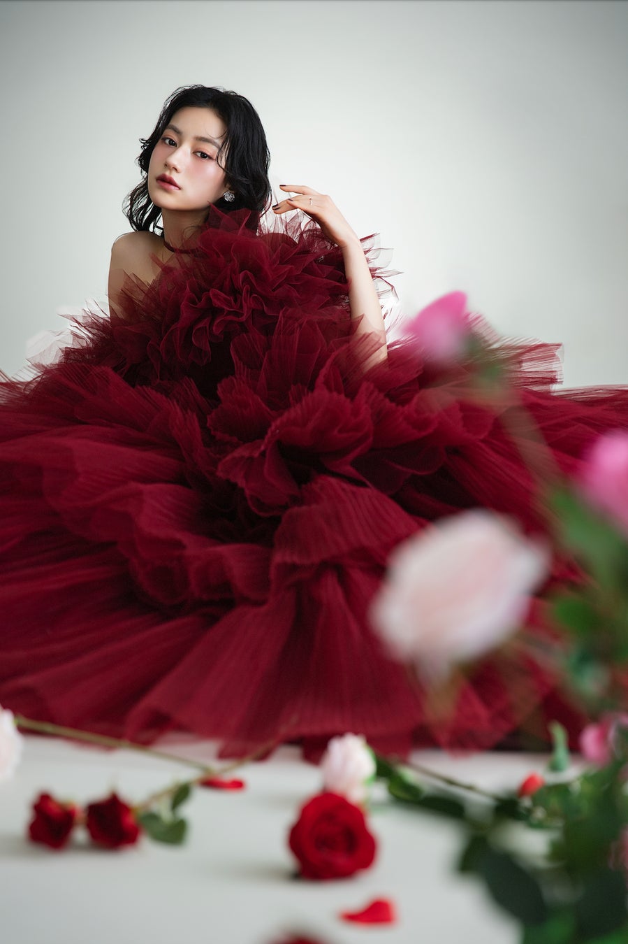 幾重にも重なるボルドーのチュールが動くたびに表情を変え、唯一無二の存在感を放ちます。
