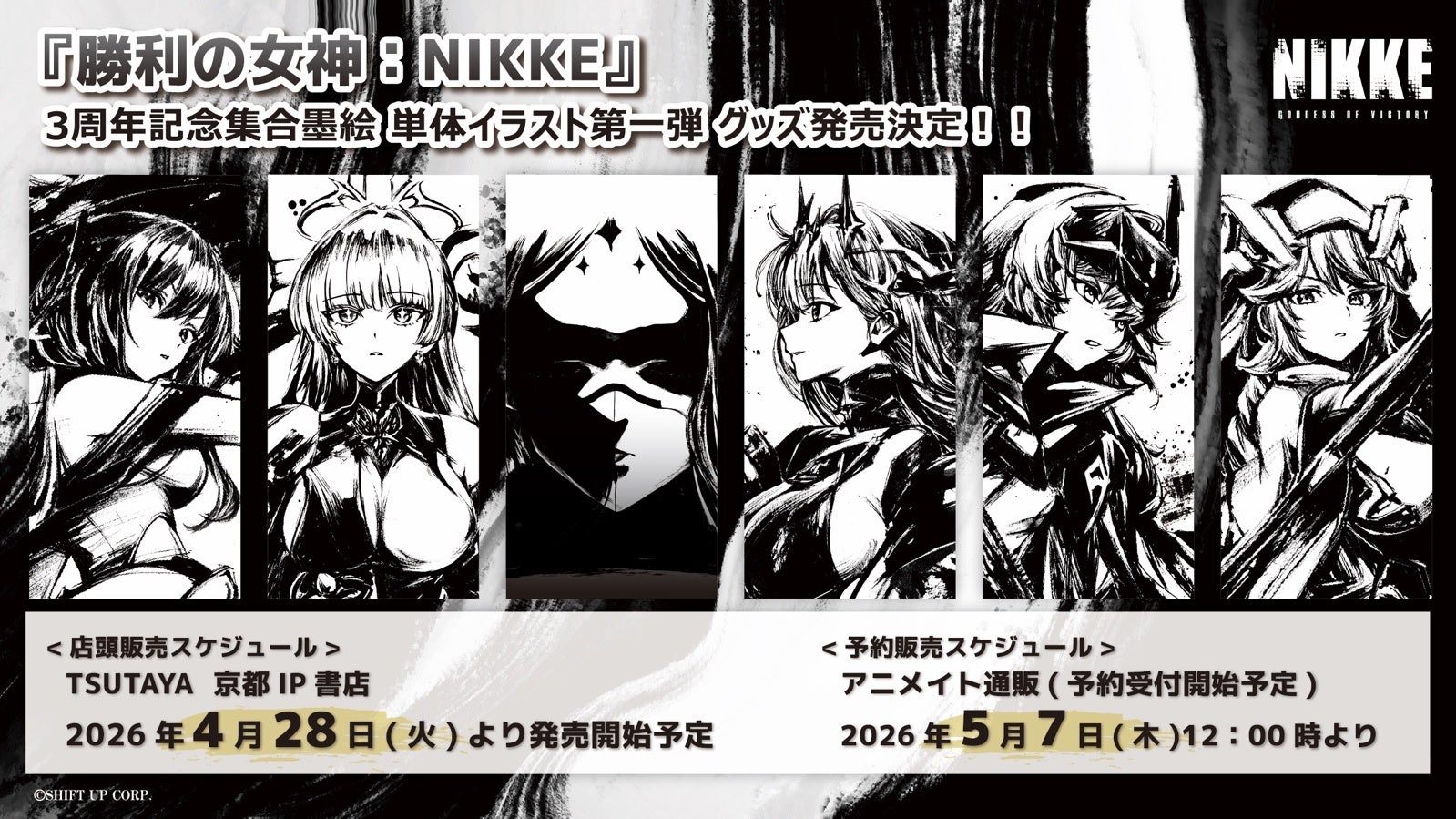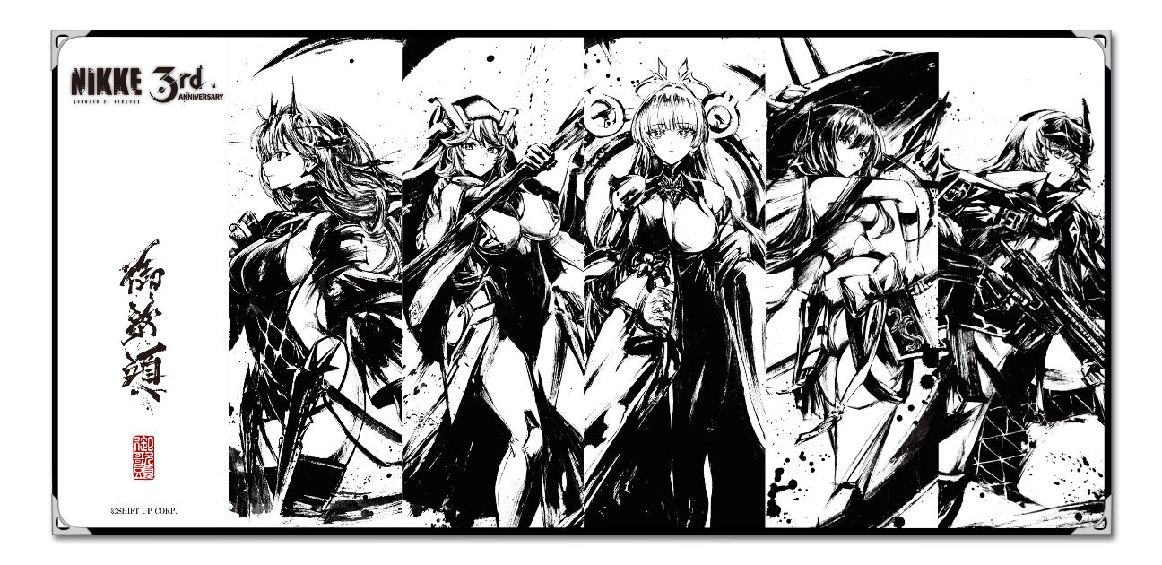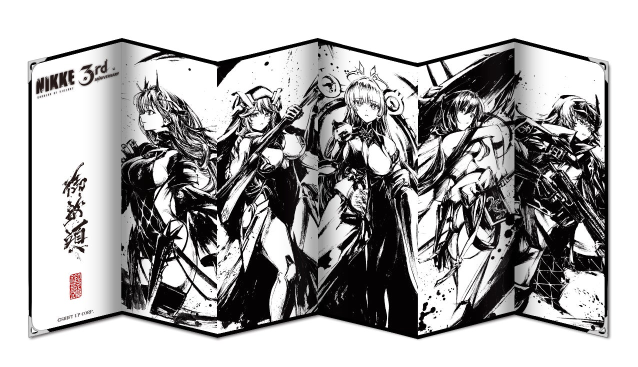 JS貿易株式会社は、戦場に響く銃声と絆~地上奪還ガンガールRPG~『勝利の女神:NIKKE』より、3周年で発表された11体からなる集合絵の墨絵グッズを発売いたしました。(作画:墨絵師・御歌頭)