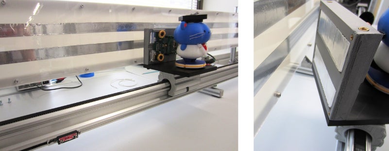 レール上を走行するロボットを用いて、簡単に検証・評価を自動化できるシステムです。