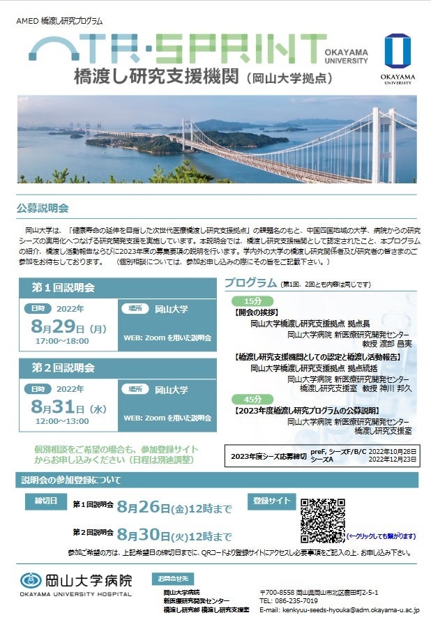 今回の説明会では、橋渡し研究支援機関として認定されたこと、本プログラムの紹介、橋渡し活動報告ならびに2023年度の募集要項の説明を2022年8月29日(月)と8月31日(水)にオンラインで開催します。