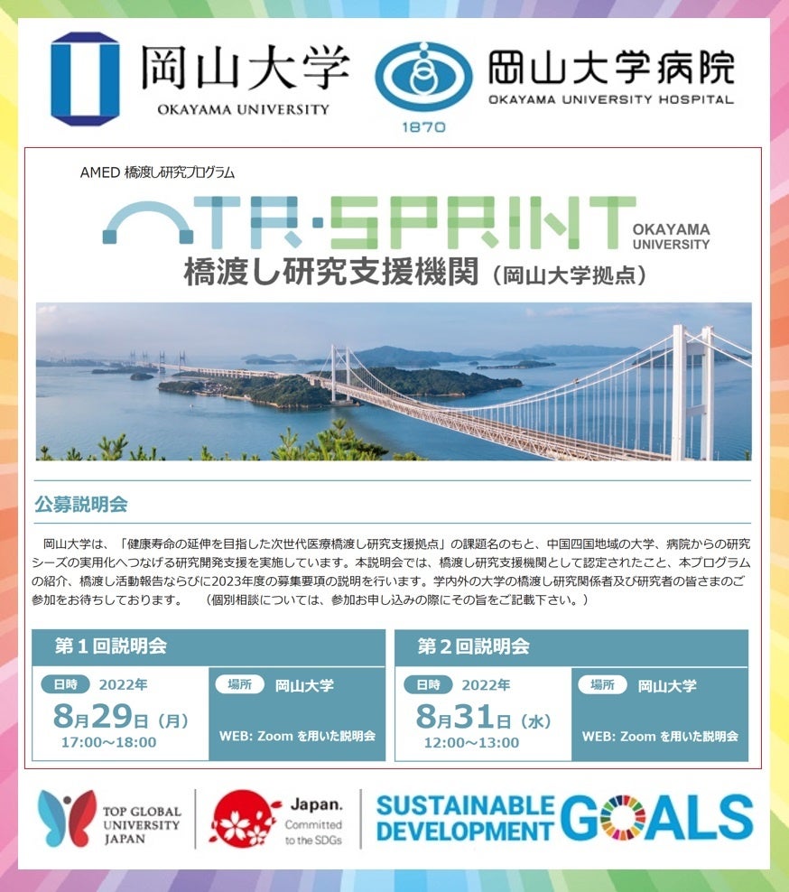 国立大学法人岡山大学(本部:岡山市北区、学長:槇野博史)は、「健康寿命の延伸を目指した次世代医療橋渡し研究支援拠点」の課題名のもと、中国四国地域の大学、病院からの研究シーズの実用化へつなげる研究開発支援を実施しています。