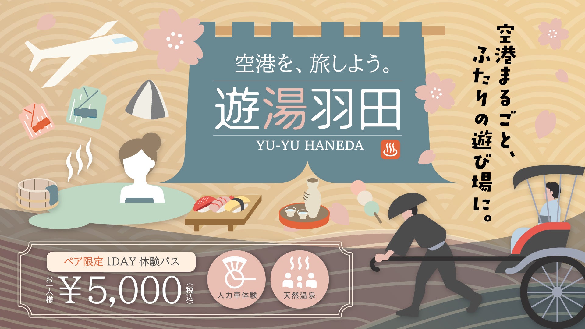 住友不動産商業マネジメント株式会社(本社:東京都新宿区/代表取締役社長:山本直人)が運営する、羽田空港第3ターミナル直結の複合施設「羽田エアポートガーデン」(所在地:東京都大田区)は、日帰りペアプラン「遊湯羽田 YU-YU-HANEDA」を販売します。人力車乗車体験と天然温泉「泉天空の湯 羽田空港」がセットになったお得なプランで、大切なパートナーや友人と特別なひとときをお過ごしください。