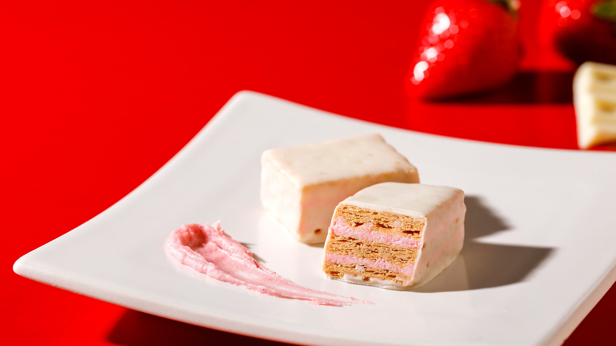 みずみずしく甘酸っぱいあまおう苺クリームを、香ばしく焼き上げられたサクサクのパイでサンドし、ホワイトチョコレートで包み込みました。