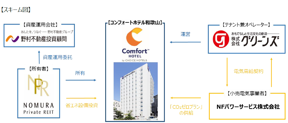 用を受託する野村不動産プライベート投資法人(以下「本投資法人」)が、本投資法人の保有する「コンフォートホテル和歌山」及び「コンフォートホテル佐賀」(以下、総称して「本物件」)のテナント兼オペレーターである株式会社グリーンズ(本社:三重県四日市市/代表取締役社長:村木 雄哉、以下「グリーンズ」)と、本物件におけるサステナビリティへの取組みを協働して推進していくことについて合意しましたので、お知らせいたします。