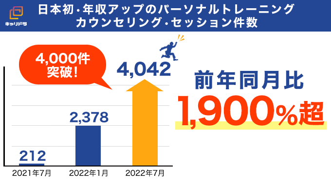 キャリドラは、 年収アップが見込めるキャリアプランをコーチングする目的でサービスを開始しました。2022年7月のカウンセリング・セッション件数は過去最高の4000件を超えており、前年同月比1,900%超となりました。 転職市場が新型コロナウイルスの逆風を受ける最中でも、 利用者の年収アップを実現させています。