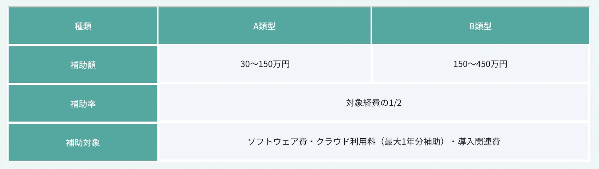 「通常枠(A・B類型)」と「デジタル化基盤導入枠(デジタル化基盤導入類型)」や「複数社連携型IT導入枠」があります。