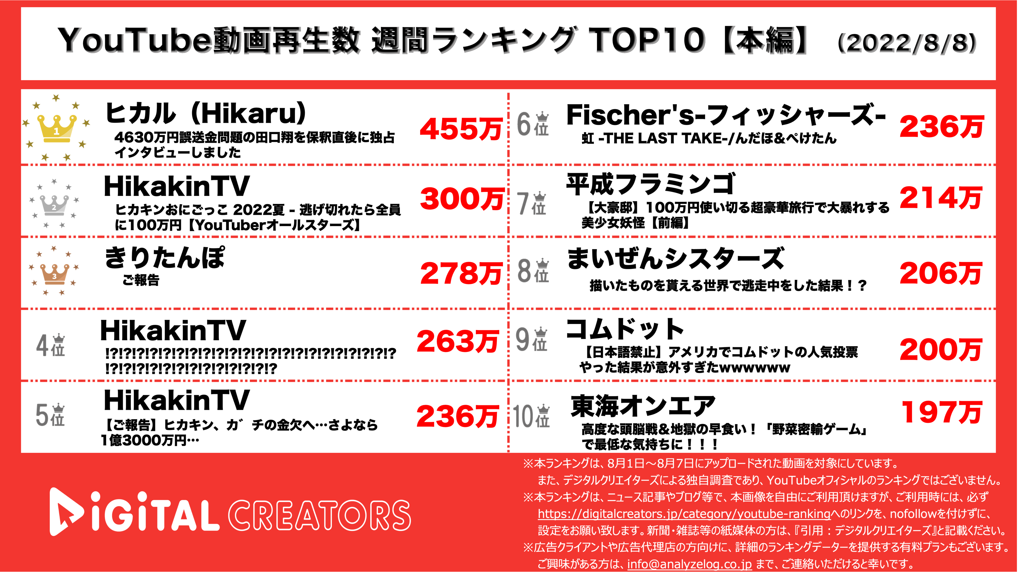 本ランキング並びに本ランキング画像は、ニュース記事、ブログ、YouTube等で、自由にご利用頂けますが、ご利用時には、必ず digitalcreators.jp/category/youtube-ranking へのリンクを、nofollowを付けずに、設定をお願い致します。新聞・雑誌等の紙媒体の方は、『引用:デジタルクリエイターズ』と記載ください。