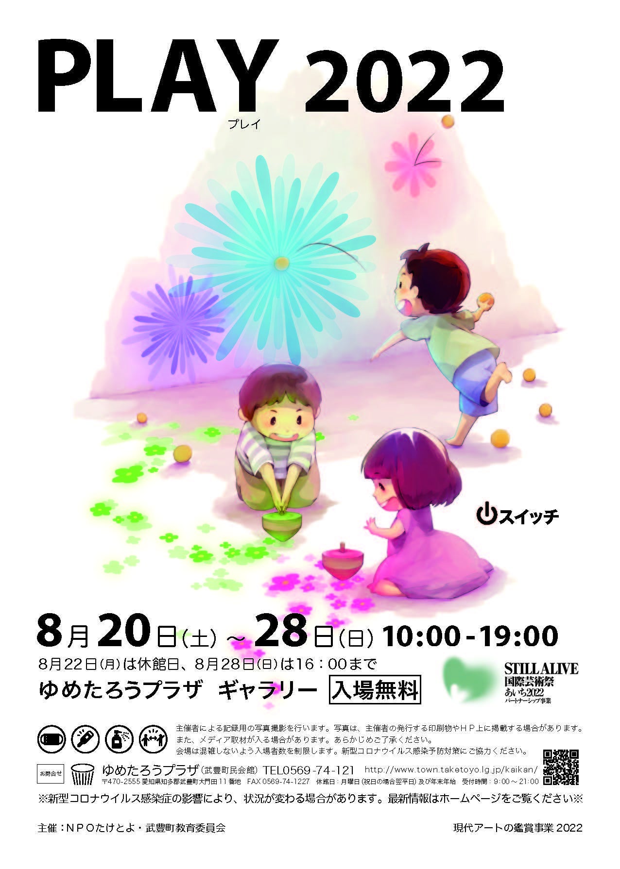 2012年の夏、名古屋造形大学デジタルメディアデザインコースの教員・学生によるユニット、スイッチによる展示「Play展」が、ゆめたろうプラザギャラリーで行われました。あれから10年が経った2022年夏、名古屋造形大学の情報表現領域の教員・学生によるユニット、スイッチがふたたび「Play2022展」で「なげる、あてる、ひろがる」と「まわる、うつる、ひろがる」を22年バージョンとして展示します。