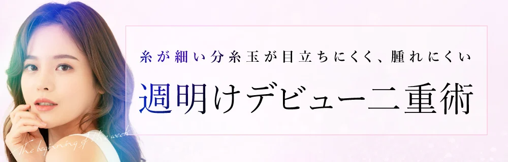 TCBでは「アオハル二重術」の提供開始直後より大きな反響をいただき、多くの患者様から「10代ではないが、同じ施術を受けられないか」というご要望を頂戴しました。皆様のお声に応えるべく、全年齢版のアオハル二重術として取り扱いを開始する運びとなったのが「週明けデビュー二重術」です。
