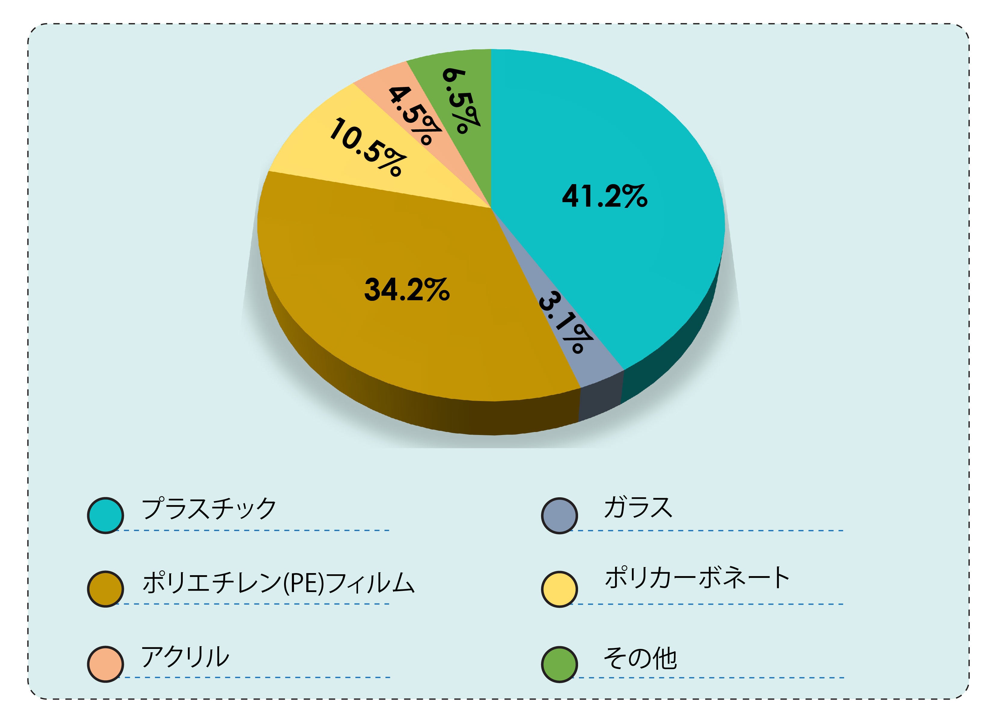 カバー材に基づいて、インドの温室園芸えんがい市場は、プラスチック、ガラス、ポリエチレン(PE)フィルム、ポリカーボネート、アクリル、その他に分かれています。