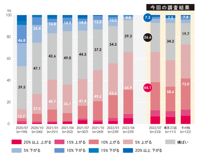 ≪ポイント≫1年後の価格が下がると予想する回答は7.3%に留まり、全体の66.1%がさらに上がると回答