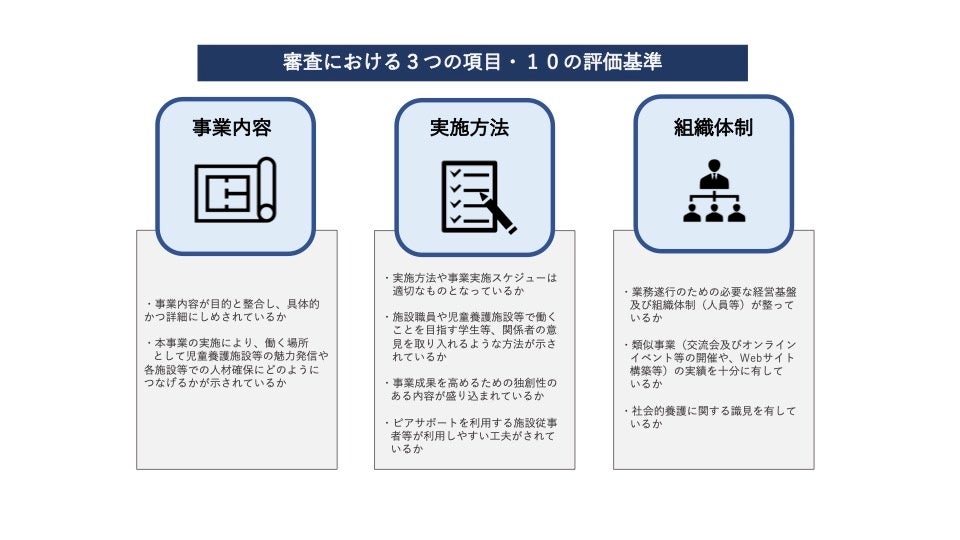 審査では、以下の3つの項目・10の評価基準から採点が行われました。