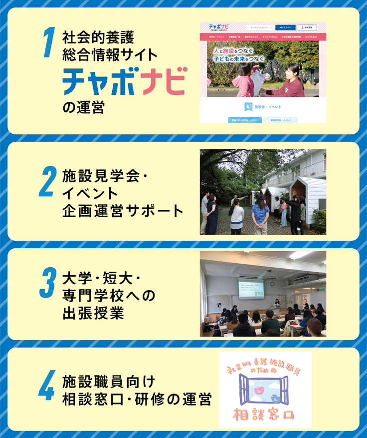 児童養護施設含む社会的養護施設の職員確保と定着を支援し、東京を中心に現在は全国へ展開する国内唯一の団体。主な活動内容は、社会的養護総合情報サイト「チャボナビ」の運営、施設見学会、大学・短大・専門学校への出張授業、施設職員向け相談窓口・研修の運営である。
