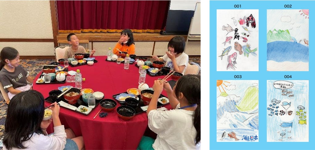 ヒラメの勉強をした後は、実際にヒラメを食べてみました。新鮮なヒラメは歯ごたえがあり食べ応えがありました。ヒラメの事を学んだ後に食べると命のありがたみを実感し、子供たちは残さず全てたいらげていました。その後、今回の調査団で学んだ事をアウトプット商品にする為のまとめ授業に入りました。今回制作したのは、海の恵みをたっぷり含んだ「魚粉のオリジナルパッケージ」です。子供たちが2泊3日で学んだ事を一つの絵にして制作します。1日目の白神山地の散策で学んだ事、秋田県の県魚ハタハタの生息する海、青森県の県魚ヒラメが食べるプランクトン豊富な豊かな海などの4つのグループに分かれてそれぞれが考えたものを絵表現してもらい、最終的に4種類の絵にしました。この絵を使って「贅沢魚粉 海プロオリジナルパッケージ」として販売します。