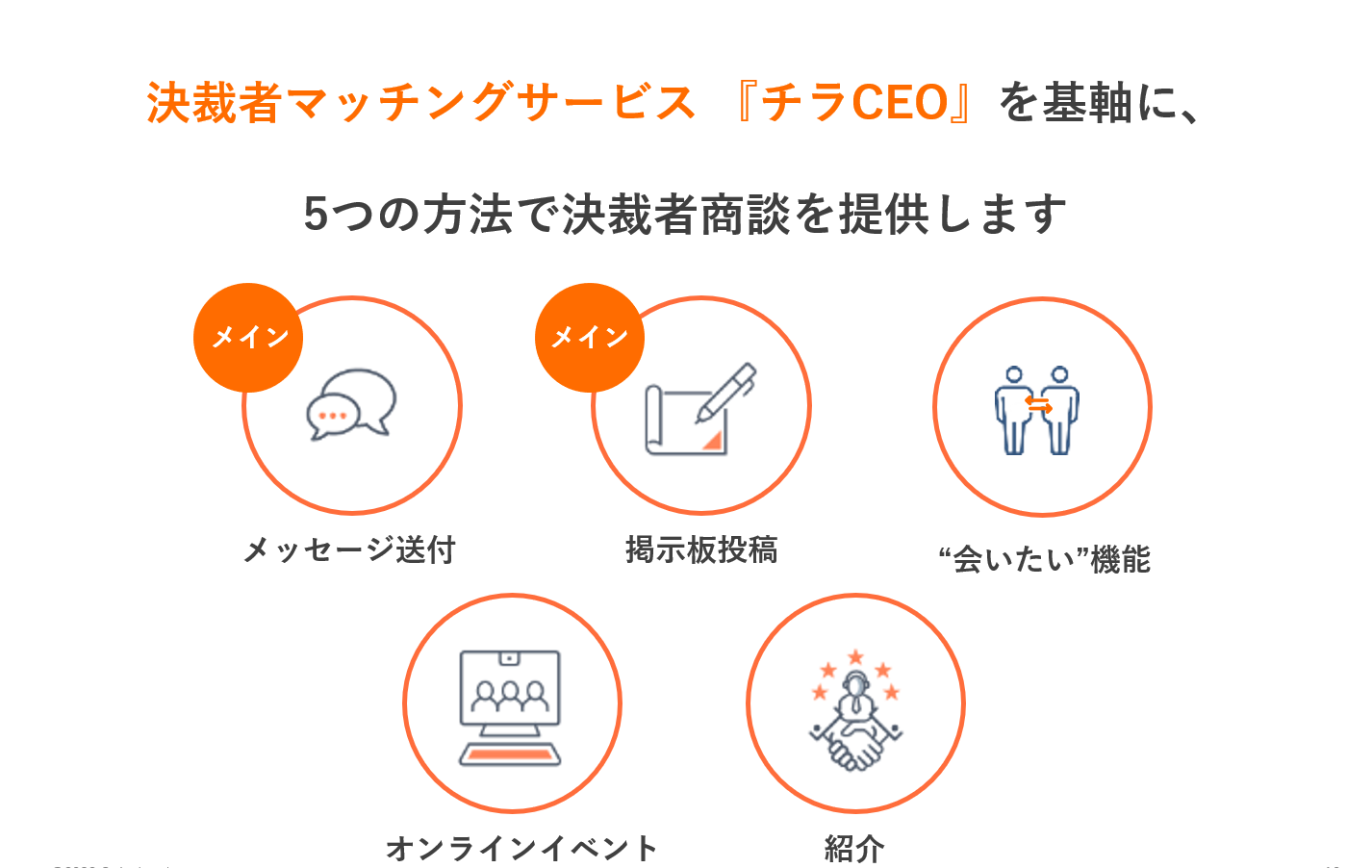 具体的な事業内容としては、決裁者マッチングプラットフォーム「チラCEO」を運営しています。2014年2月から8年以上、決裁者マッチング事業のパイオニア的立ち位置として事業運営してきました。