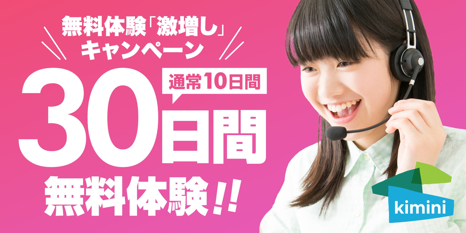 ただいま、Kimini一番人気のプランであるスタンダードプラン「10日間」の無料体験を「30日間」に増量中です!