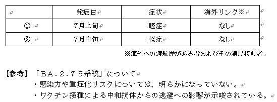 この度、ゲノム解析の結果、新たに、オミクロン株の亜系統である「BA.2.75系統」を2例確認したため、下記のとおり、お知らせいたします。