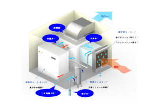 メインシステムにより大風量の調温調湿を行い、その風を室内ファンで工場の各所に届け、部分的に小型のエアコンで補う方式を基本とします。これによりエアコンと同等の室内空間を実現しながら、全量大風量換気を行いながら省エネを実現することになります。