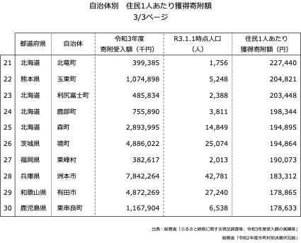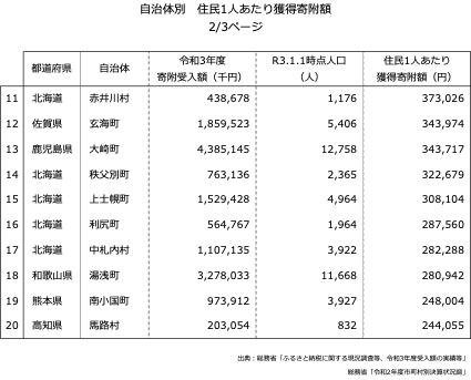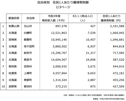 『令和3年度ふるさと納税寄付額を「住民一人あたり獲得寄付額」にて分析』の主な結果